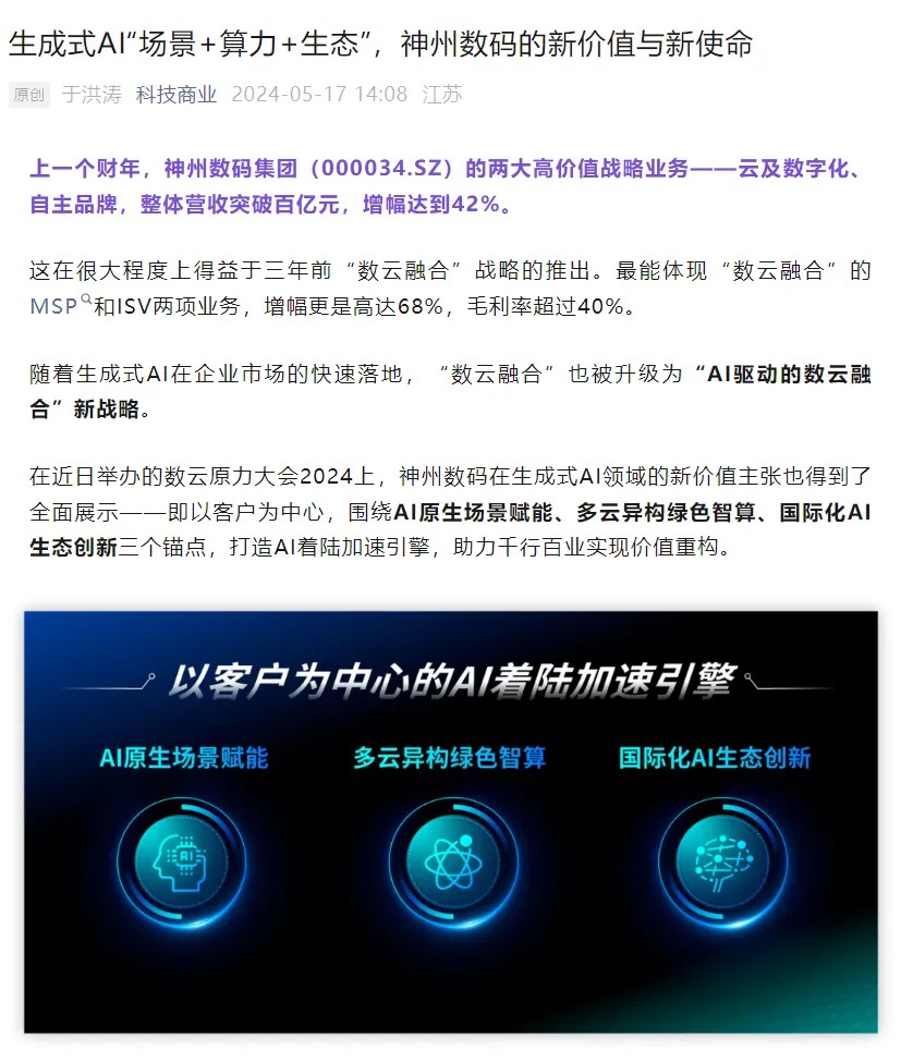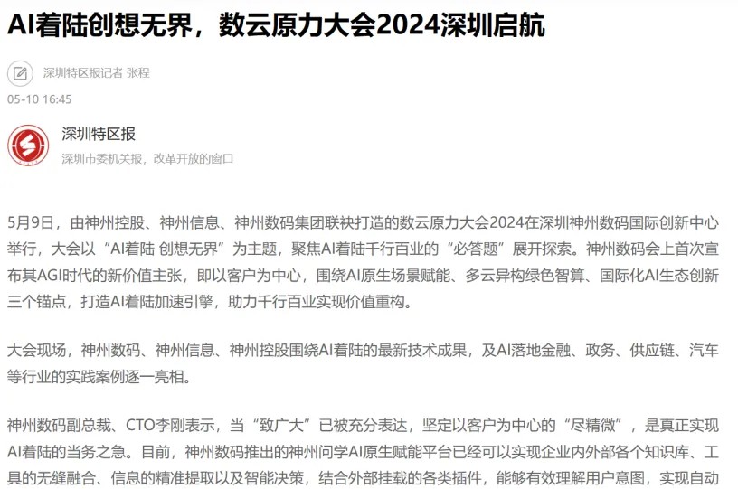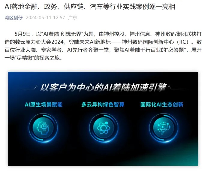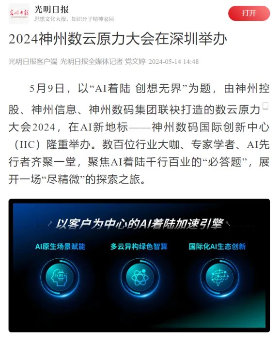 近日,由神州控股、神州信息、710公海集团联袂打造的年度盛会——数云原力大会2024开幕式,在未来AI新地标——710公海国际创新中心(IIC)圆满落幕。这场以“AI着陆 创想无界”为主题的活动,不仅引起了业界的广泛关注和讨论,也引发了媒体的争相报道。