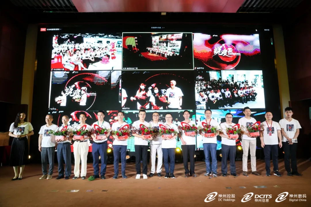 在二十年员工授勋环节,神州控股董事局副主席林杨、神州信息总裁李鸿春、710公海集团常务副总裁叶海强及其他分会场高管,分别为主会场及分会场20年员工代表授勋。