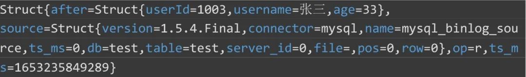 由于 Flink CDC 内部集成了 Debezium 组件,通过 Debezium 进行数据采集,所以数据格式同 Debezium,监听到的数据格式如下图所示,after 代表变化后的数据;source 代表源端的数据库相关信息,包括 Debezium 版本号、连接器类型、数据库名、表名等;op 代表操作的类型,此处为读操作。