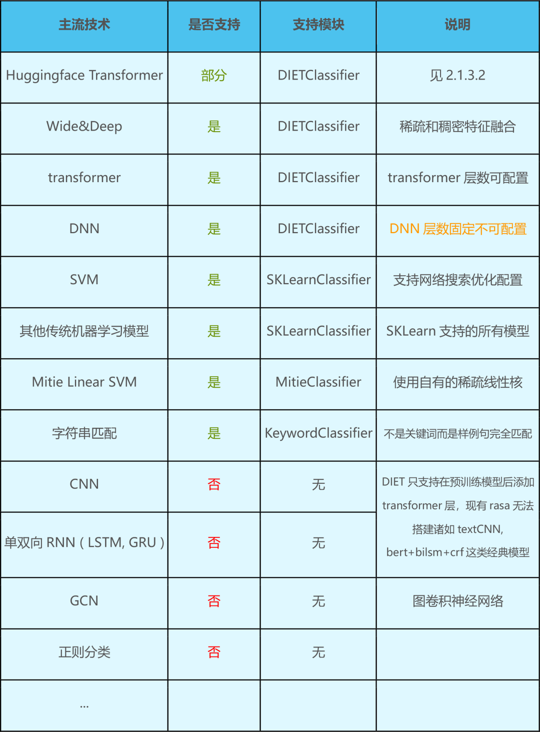 Rasa 对 Sklearn中的所有分类器都支持,包括并不限于以下: