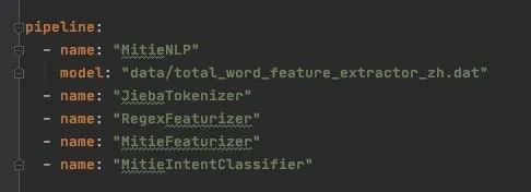 每个mitie组件都依赖与MitieNLP,因此它需要被放到pipeline中所有mitie组件之前,初始化mitie结构。