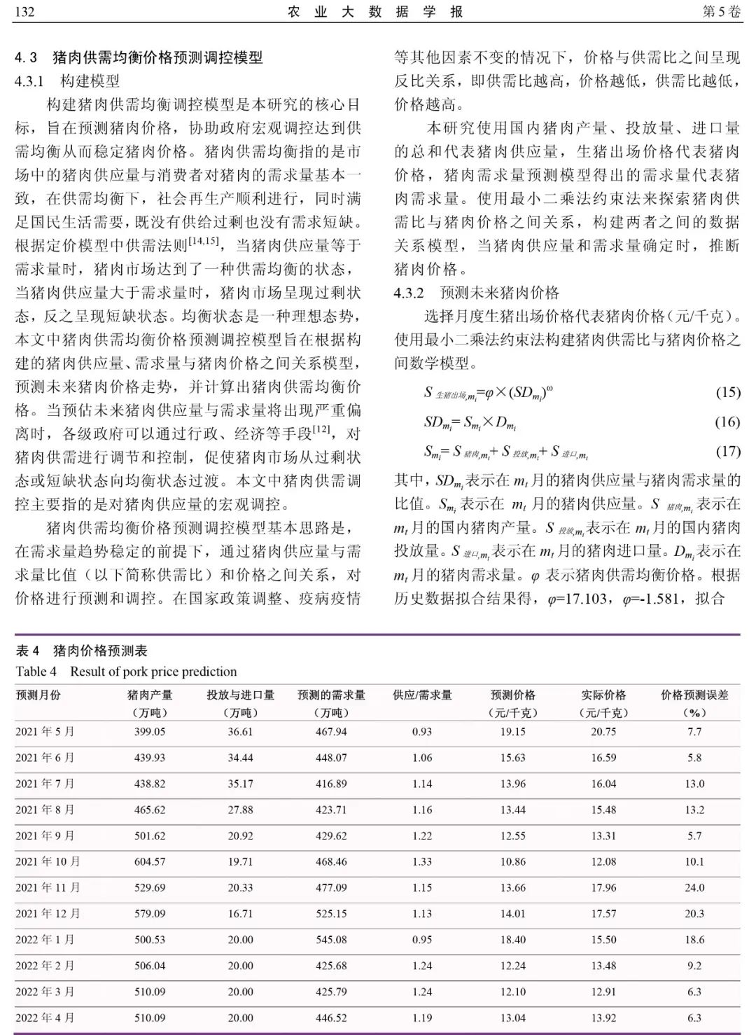 该研究论文提供了通过调整影响猪肉供应量的核心因素来调节未来猪肉价格走势的思路和方法,旨在科学预测猪肉供需量及未来价格走势,协助政府相关部门合理及时调控猪肉供给,促进各时刻的猪肉供需均衡,猪肉价格稳定在供需均衡的合理区间。
