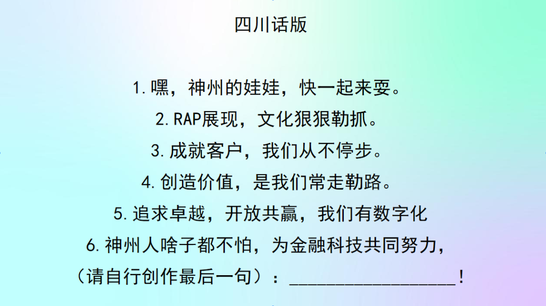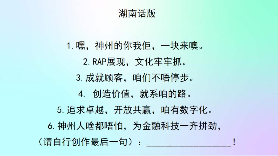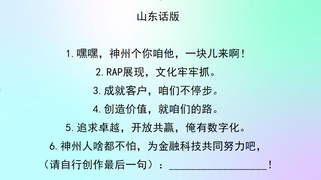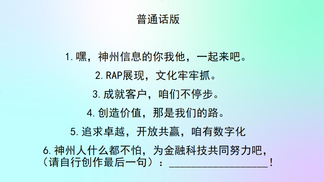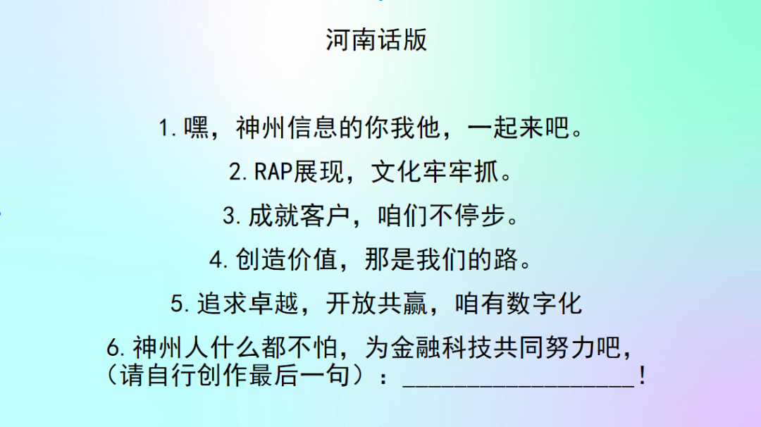 你对神州信息的新文化价值观熟悉吗?来来来,欢迎来参加神州Rapper挑战赛!让我们用最嗨皮的方式说出我们对神州信息新文化的理解。速度为王,又快又好!
