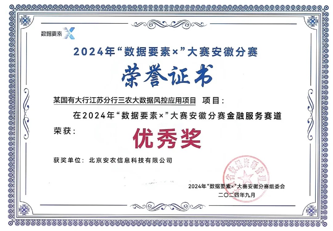 神州信息旗下的北京安农信息科技有限公司参赛团队“某国有大行江苏分行三农大数据风控应用项目”,从众多参赛项目中脱颖而出,获得2024年“数据要素x”大赛安徽分赛金融服务赛道优秀奖!